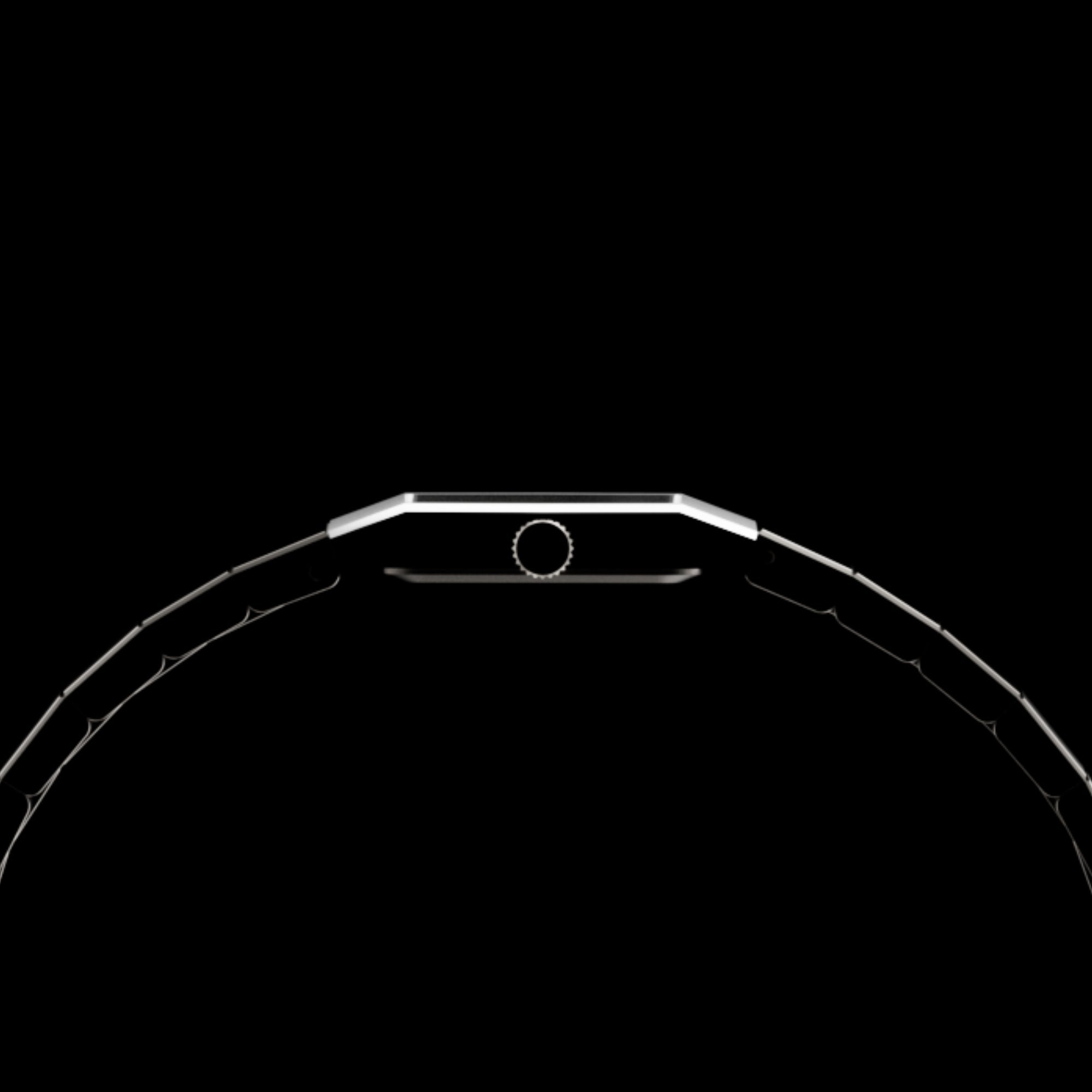 Lancette dauphine e indici a bastone applicati, racchiusi in una cassa poligonale ultra-sottile (6mm) in acciaio inox 316L. Quadrante nero con finitura soleil, protetto da vetro zaffiro.