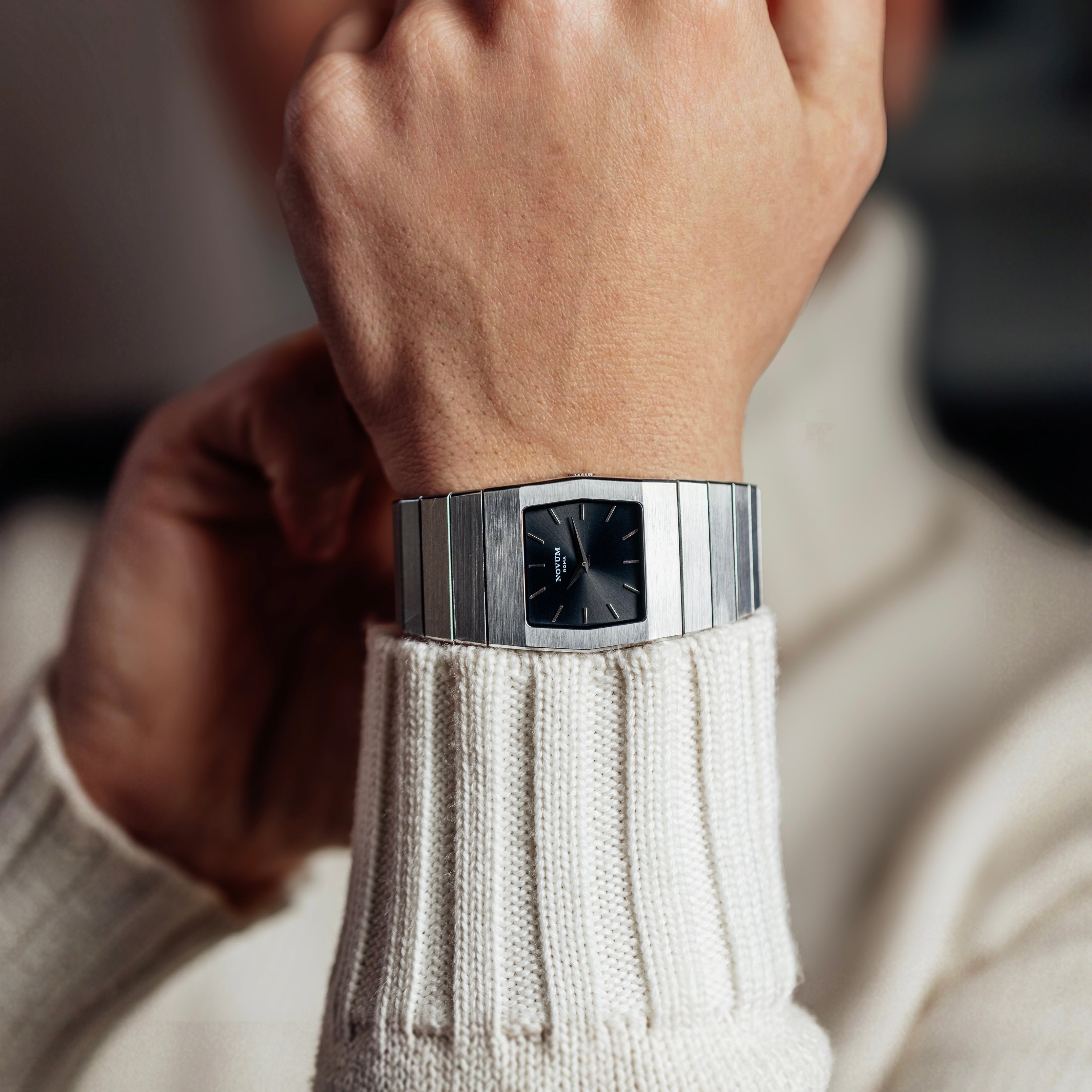 La cassa poligonale ultra-sottile valorizza un profilo compatto e distintivo, incorniciando il quadrante nero con finitura radiale, che cattura la luce con raffinata discrezione. A proteggerlo, un resistente vetro zaffiro, garanzia di eccellente durabilità e resistenza ai graffi.